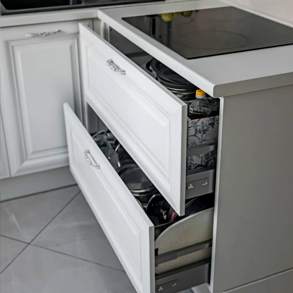 Кухонная фурнитура представляет собой элементы, такие как ручки, петли, ножки и выдвижные механизмы, которые значительно облегчают повседневную жизнь хозяек. Стоимость комплектующих для кухонной фурнитуры может достигать 25% от общей стоимости гарнитура. Мы всегда используем надежные компоненты высокого качества. Подбор необходимых элементов осуществляется с учетом ваших предпочтений, и включение доводчиков входит в стандартное оснащение.
